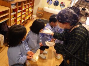 先生から「明日はおもちつきしようね」と話を聞き、