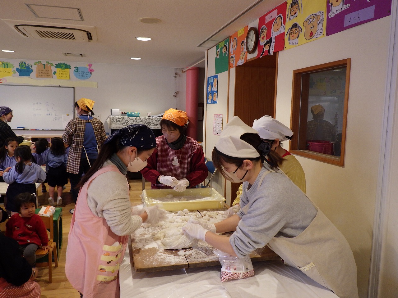 子どもたちがついたおもちを、ちぎってくれるお母さんたち。
