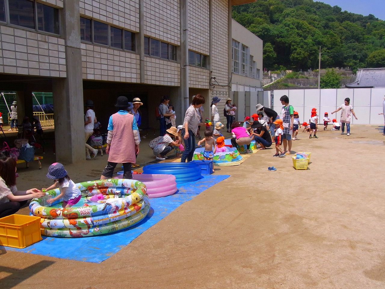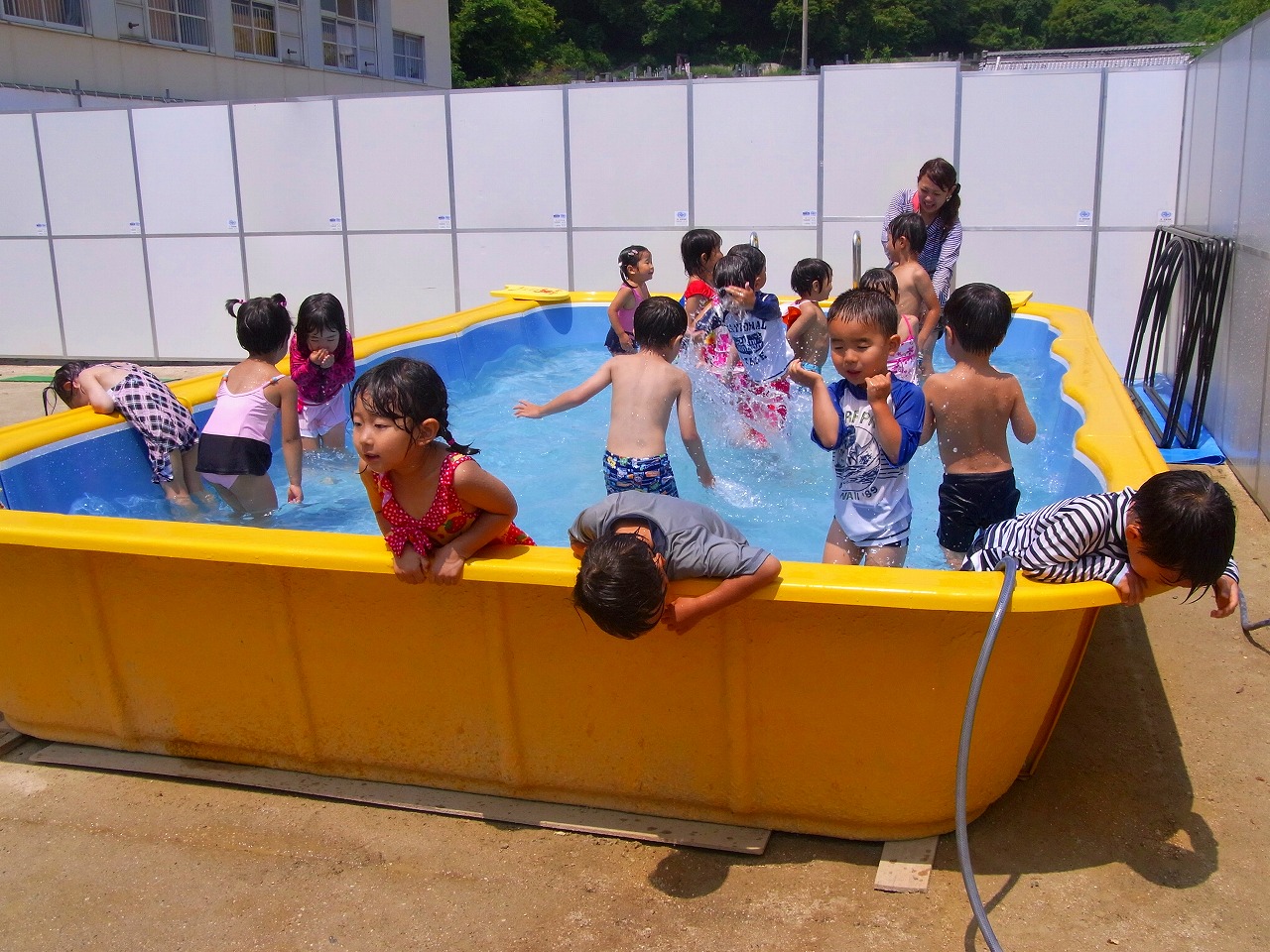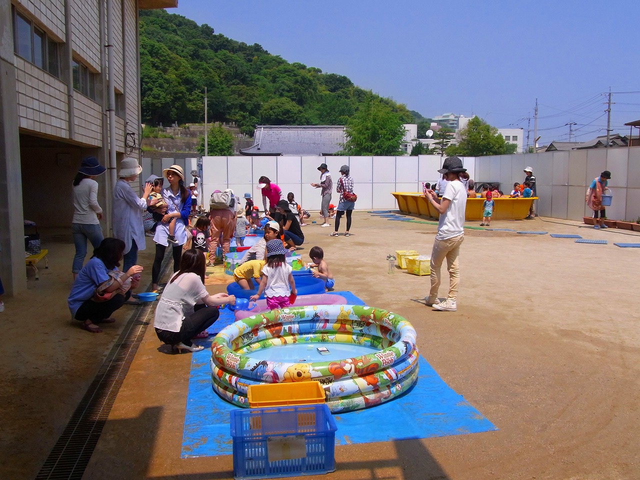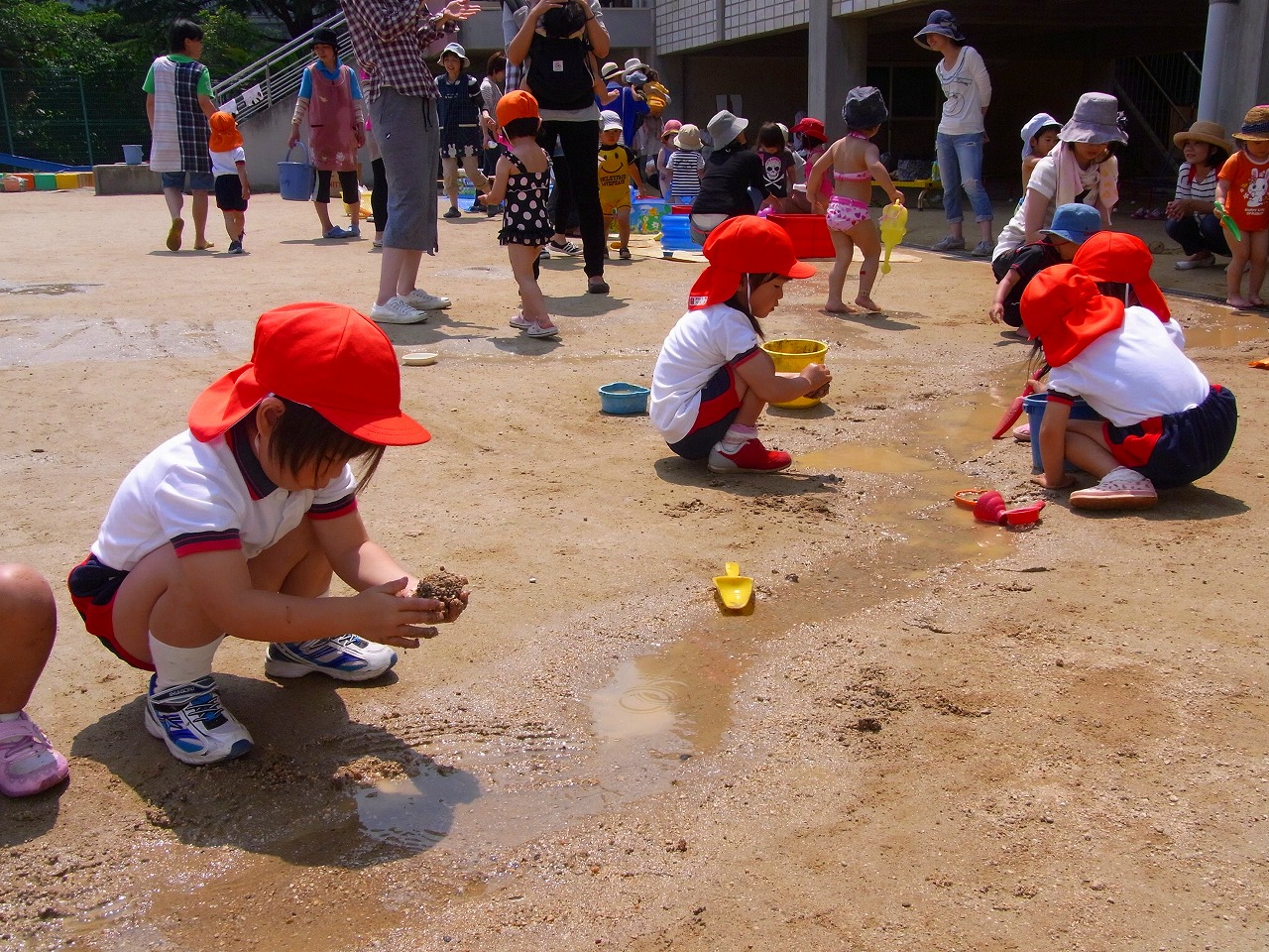 園庭にはプールからの水で泥遊びをする園児もいますし・・・